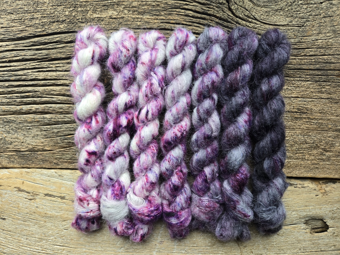 Entering my Villain Era is available on sock and suri silk gradients, as well as dyed as full skeins of sock yarn and sometimes on my specialty luxury base of Alpaca/Cashmere/Silk too.  Custom sizes and bases are available if you’re looking for something in particular.