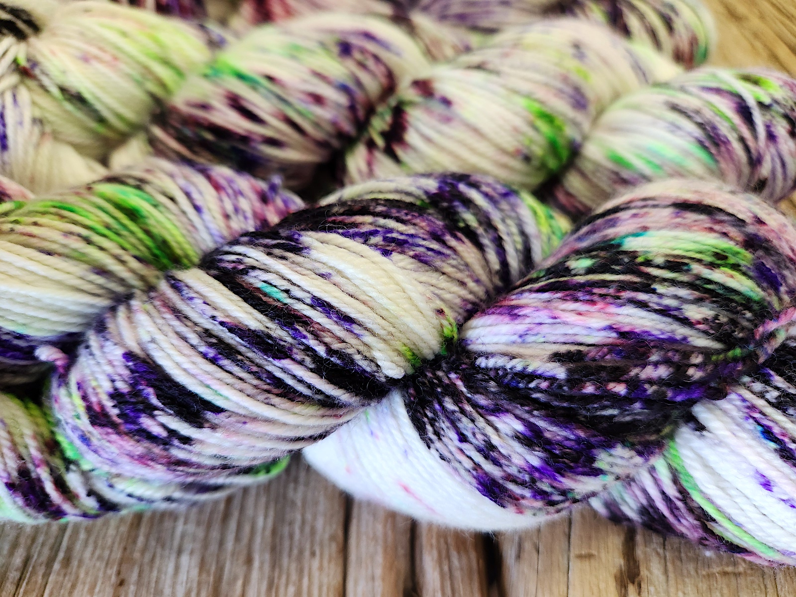 The Goblin Queen is a deep and textured yarn! Drops of black, green and purple will add some elegance to your project.