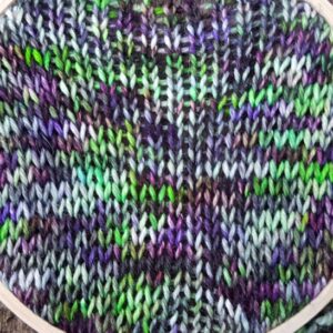 In this colourway, the green is UV/black light reactive. At one point, I was out to a live performance while also trying to work on a project…and I could see it in the dark! The practical uses for UV reactive yarn….who knew!?